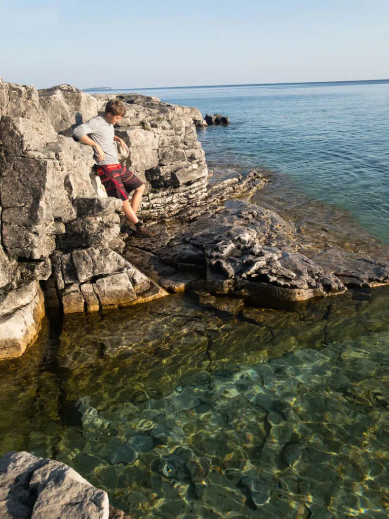 The (arguably) most stunning of those sea caves is the Grotto. Carved by wave action through ancient limestone, the Grotto is filled the turquoise water of Georgian Bay, and illuminated by the sun’s rays slipping through openings in the cliff beneath the surface.